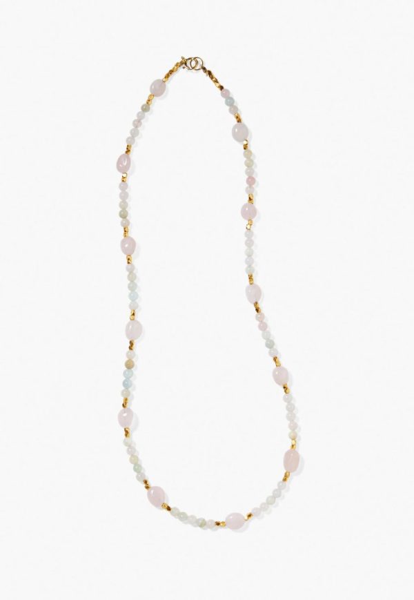 A beaded necklace with a harmonious blend of rose quartz and gold fill brass beads. The varying bead sizes create a dynamic, eye-catching pattern.