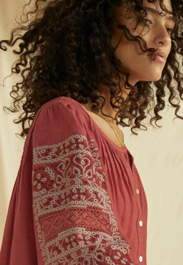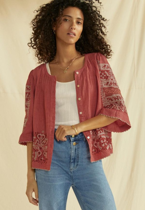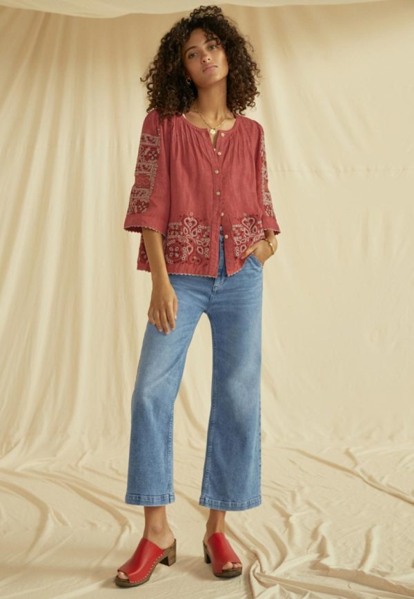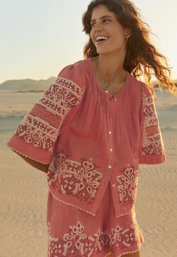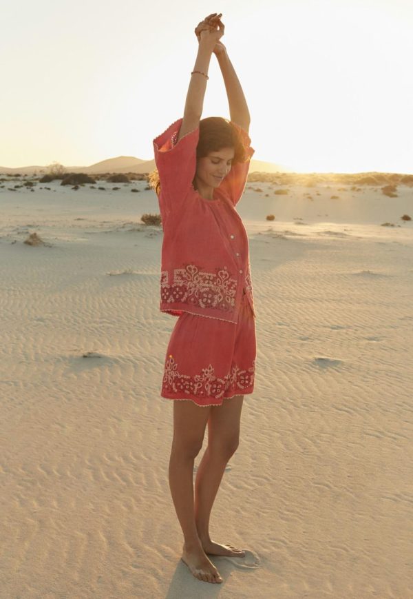 Wear this beautiful linen blouse buttoned up and tucked into denim or leave it undone and you’ve got a statement light jacket to shrug over a dress. Special embroidery and lace inserts on the sleeves and around the hem catch the eye. Love a co-ord? Pair with the matching shorts