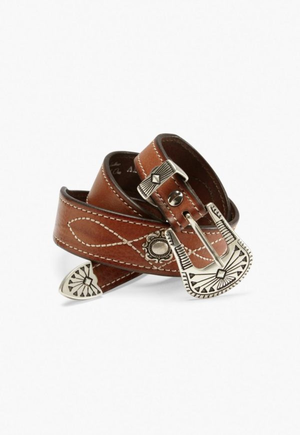Brown leather belt crafted with intricate contrast stitching and adorned with decorative metal studs. With an adjustable metal buckle, featuring engraved detailing at both the buckle and end tip.