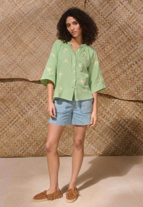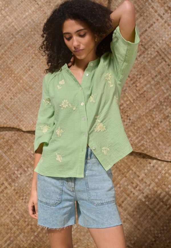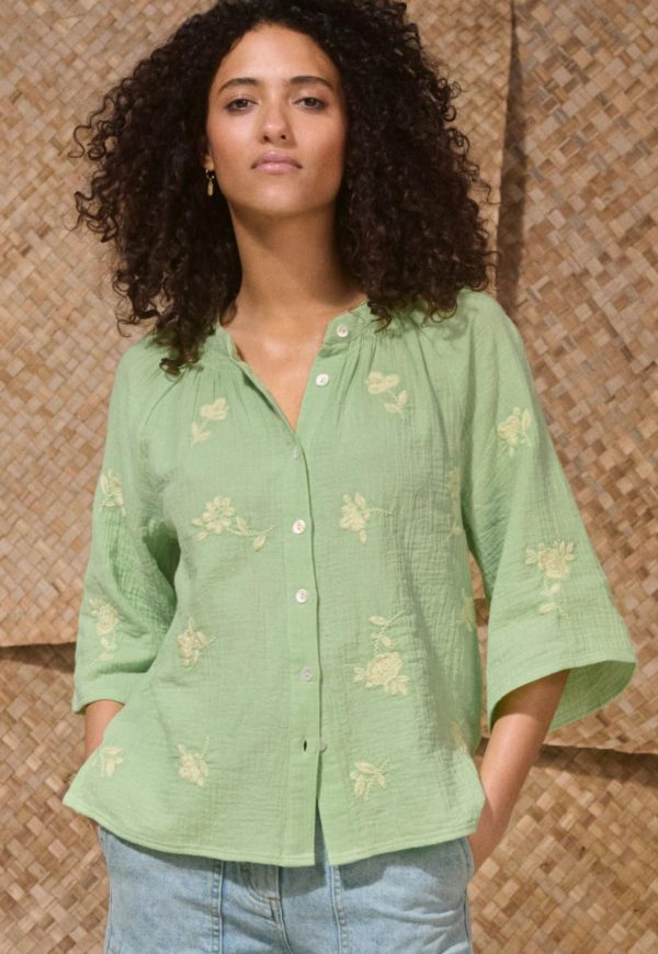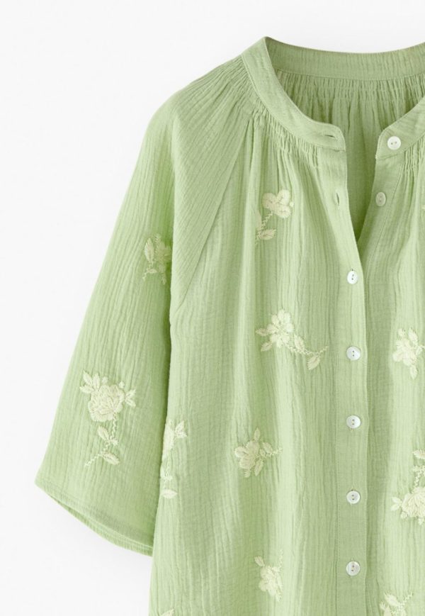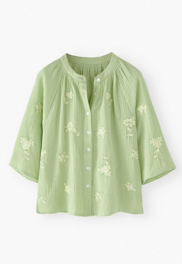 A beautiful blouse in gauzy double cotton that’s finished with gorgeous embroidered flowers. In a boxy fit with a round neckline and wide, elbow length sleeves. Wear it buttoned up and tucked into jeans or keep it undone to double as a light jacket.