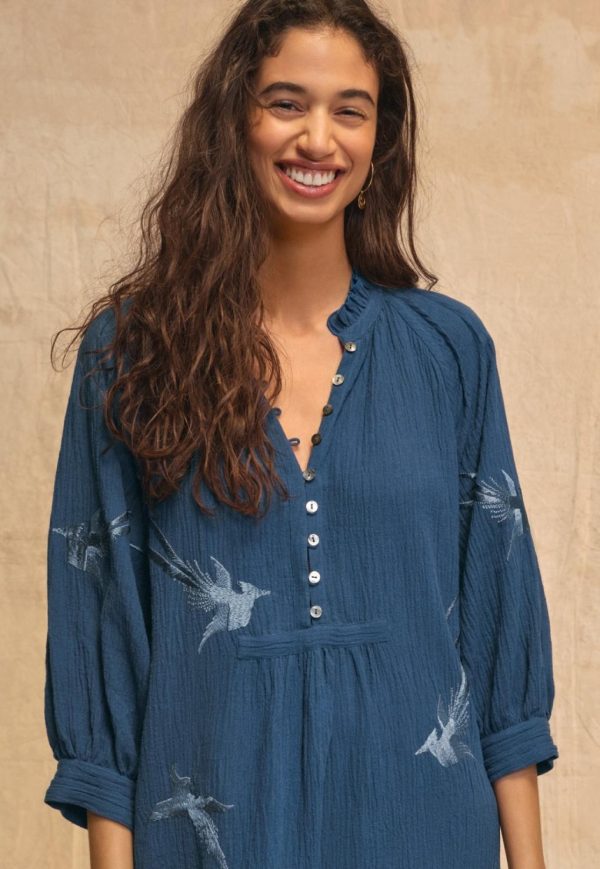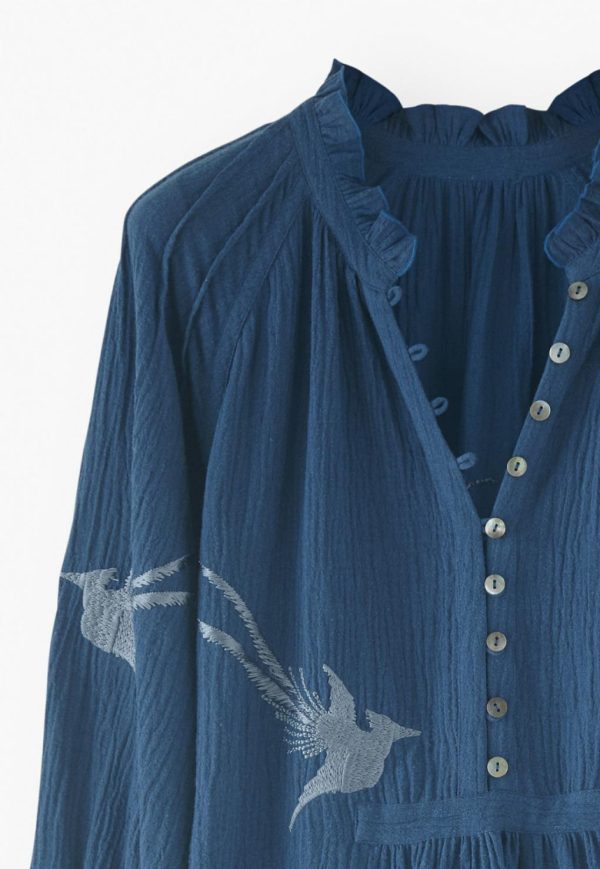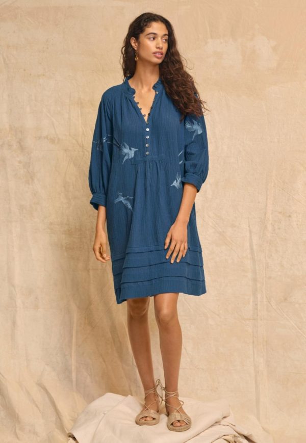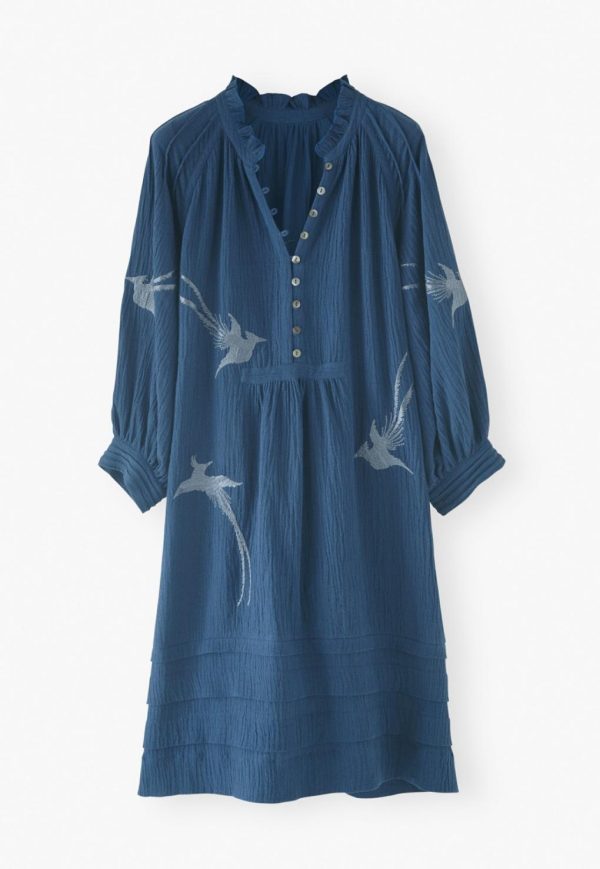 Beautiful crinkle cotton linen dress featuring exquisite all-over embroidery of birds of paradise, symbols of freedom. Long sleeves make this perfect for dinner out on cooler evenings.