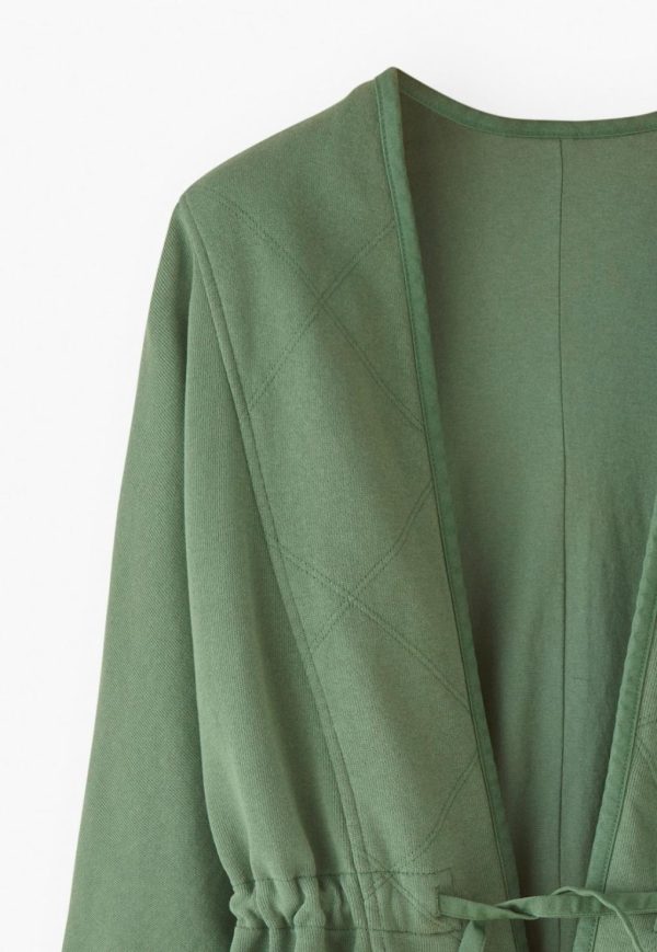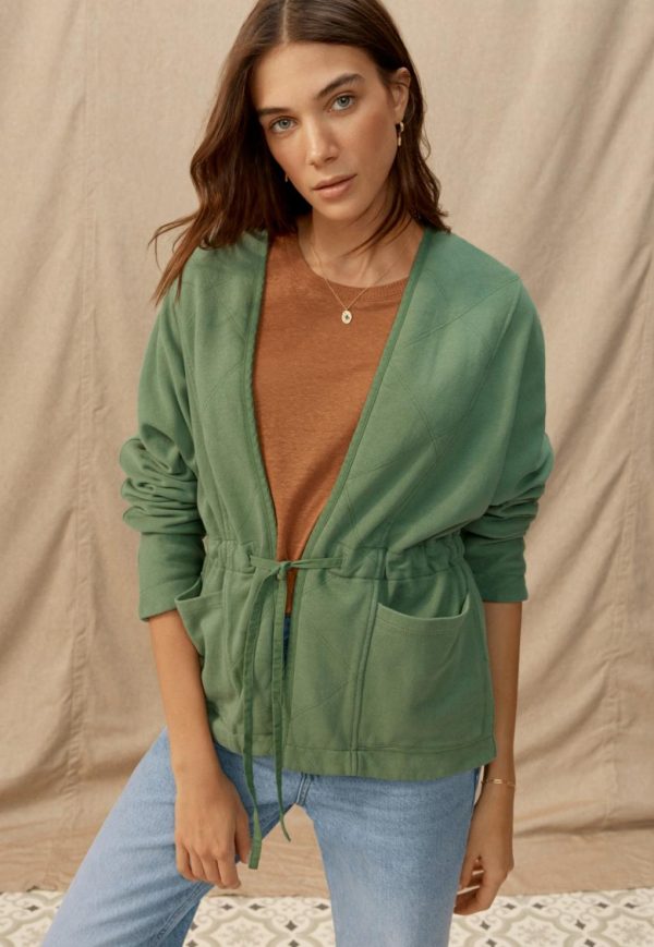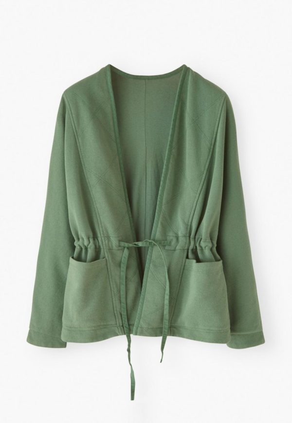 An easy, relaxed organic cotton jersey jacket with an elevated edge. With a broad quilted trim, the waist can be cinched with the drawstring tie, or leave it loose as a chic layer for downtime days.