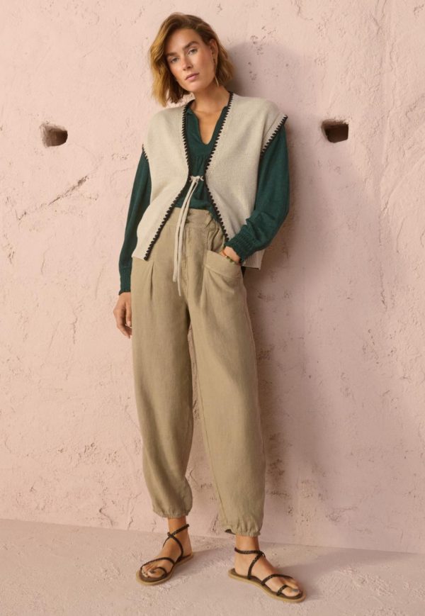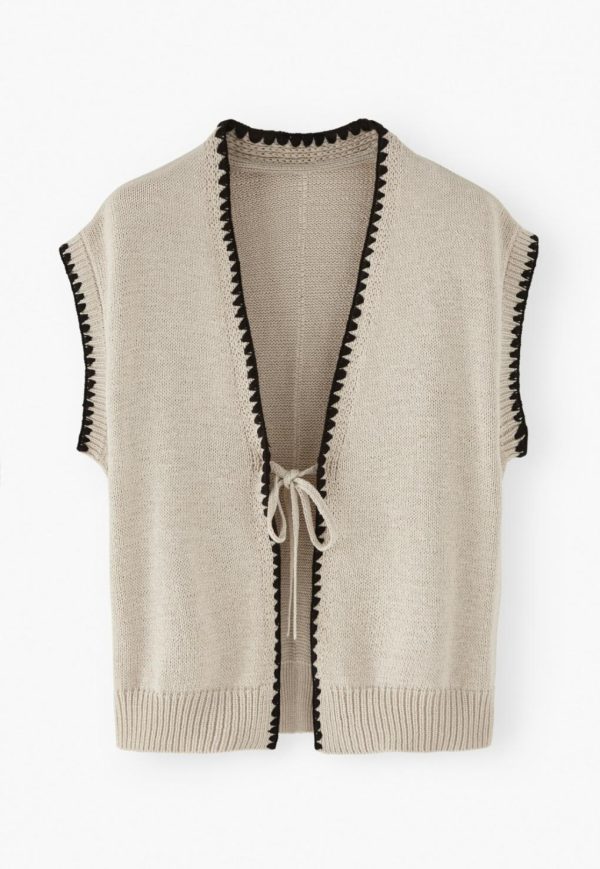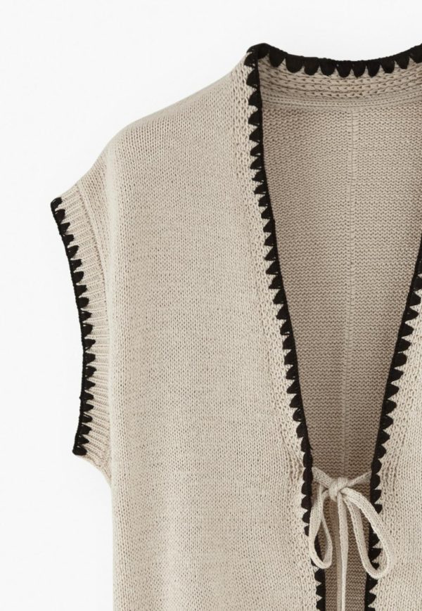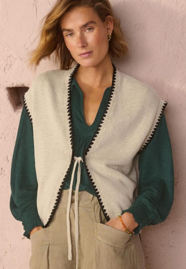 Contrasting zig-zags are stitched around the edges of this versatile sleeveless top. Knitted from a smooth organic cotton blend, it’s deliberately relaxed for an easy fit and fastens with soft knitted ties.
