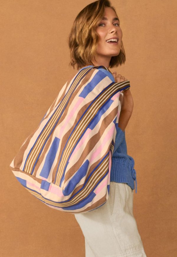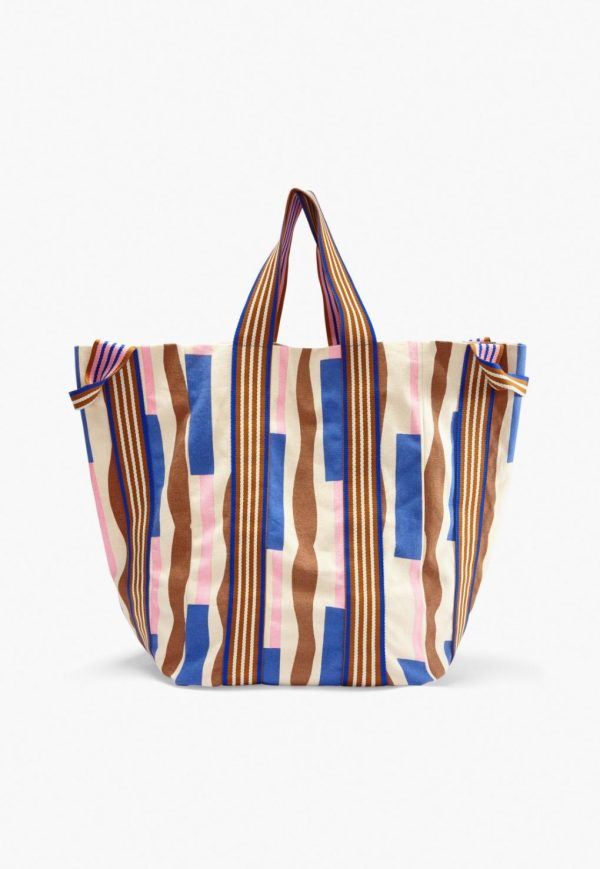 A statement sized bag with a square base, so very capacious. In cheerful pink and blue cotton canvas, with wide straps for comfortable carrying, and an interior zipped pocket, it closes with large poppers.