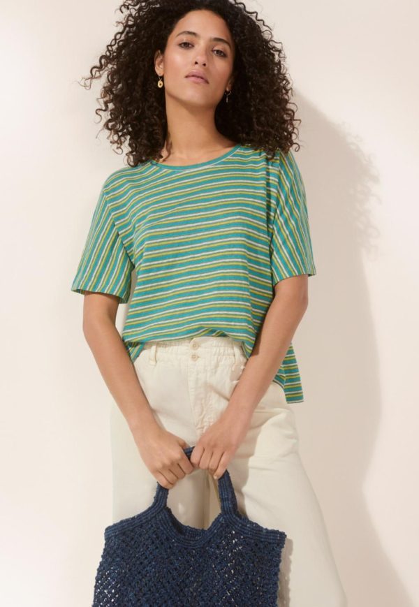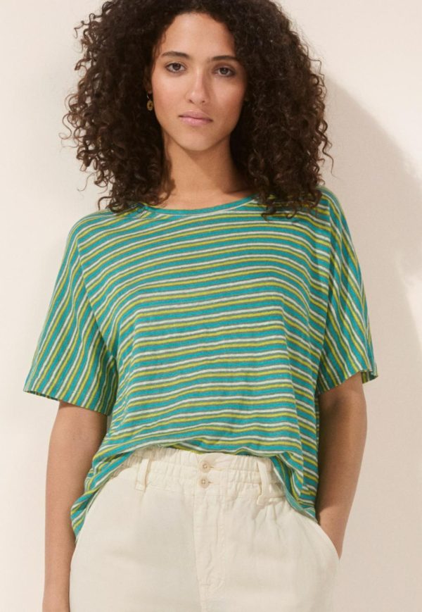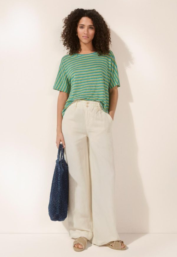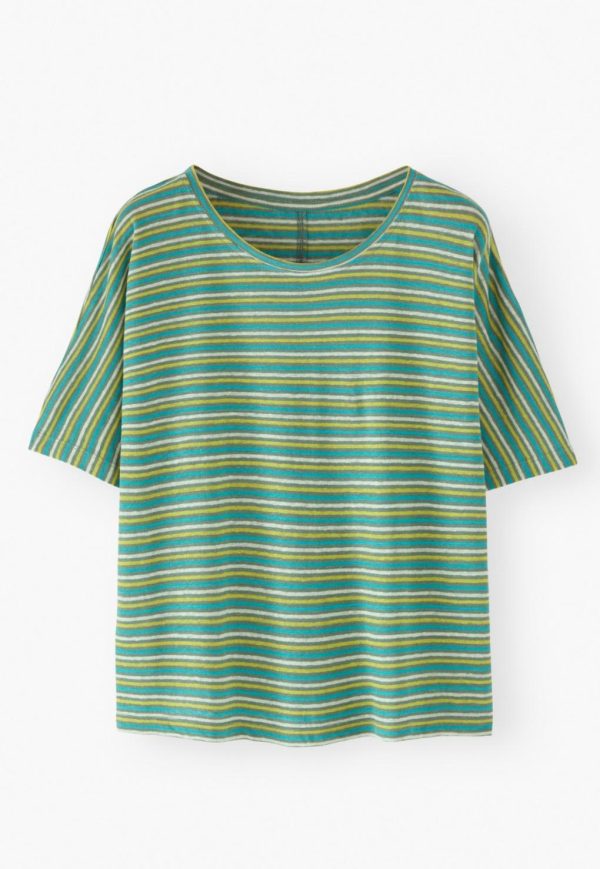 Stripes designed to lift the spirits in lightweight linen jersey. A boxy fit T-shirt with a round neckline and elbow-length dolman sleeves. There’s a nice seam detail at the centre back too.