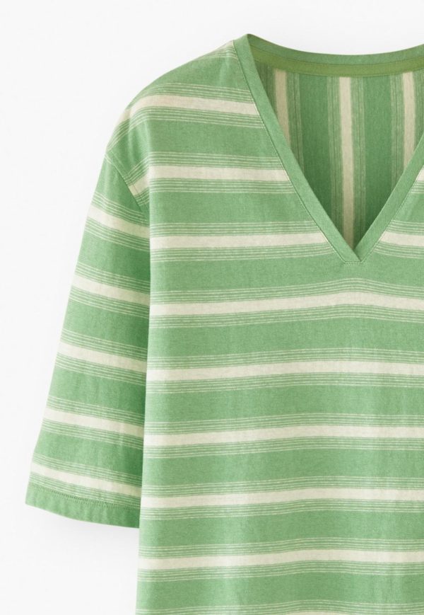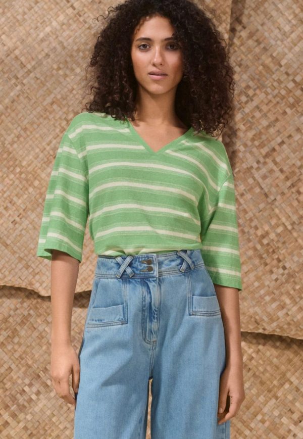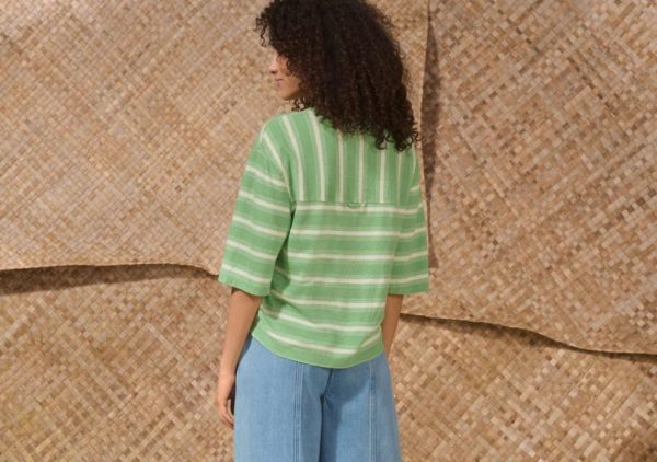 For stripe lovers looking to add something special to their collection. This v-neck boxy t-shirt in hemp and organic cotton jersey has casual dropped shoulders, elbow-length sleeves and comes in fresh colour combos.