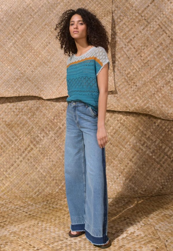 A new cut for your jeans collection in reassuringly rigid blue denim. High-waisted and wide-legged, they’ve got a cool stripe along the side seam and a let-down hem that finishes with a raw edge.